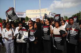 SANTO DOMINGO.- Organizaciones feministas protestaron este miércoles frente al Congreso Nacional para que se impongan penas más duras a quienes cometen feminicidios o usen violencia contra la mujer.