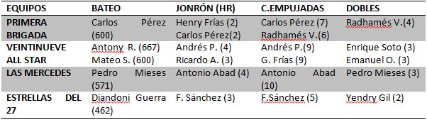 En los encuentros el equipo Primera Brigada ganó sus dos juegos a las Estrellas del 27 con pizarra de 15-5 y 6-4, mientras que en la tarde el Veintinueve All Star derrotó en su primer enfrentamiento 12-2 a los integrantes de Las Mercedes. Para el segundo choque Las Mercedes se mantuvo arriba hasta la 6ta. entrada, pero la buena combinación de picheos de los lanzadores contrarios y los oportunos bateos, provocó que el juego se fuera extra inning, lo que permitió que los número de la pizarra cambiaran y el equipo Las Mercedes quedara en el terrero con número desfavorable de 20-19.