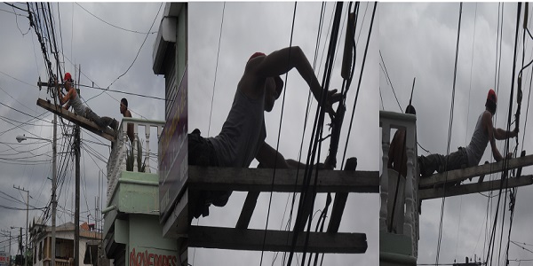 El joven que llevaba a cabo la maniobra acrobática estaba siendo auxiliado por otro, que al parecer también desconocía el peligro a que se exponen con esta arriesgada forma de llevar la luz a hasta su casa.