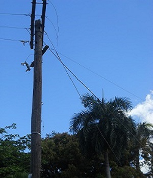 PEDRO BRAND. Equipo de contratista de la Empresa Distribuidos de Energía del Sur (EDESUR) trabajan en la reposición de unos 250 metros de alambre de alta tensión del tendido eléctrico, luego que desaprensivo se lo robaran anoche dejando a oscura varias viviendas del sector Los Pabellones detrás del Centro de Salud Mental Padre Billini en este municipio.
