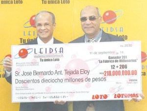 SANTO DOMINGO.- La Lotería Electrónica Internacional Dominicana, S.A. (Leidsa “Tu única Loto”) entregó los 218 millones de pesos a José Bernardo Antonio Tejada Eloy, ganador del premio más grande en la historia de loterías en el país.