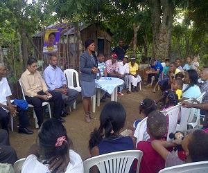 PEDRO BRAND.- La doctora Juana Piña Solano (Kathy), aspirante a Alcaldesa por el Partido de la Liberación Dominicana (PLD) en este municipio sostuvo un encuentro con moradores del barrio “El Kilombo” del kilómetro 28 de la autopista Duarte.