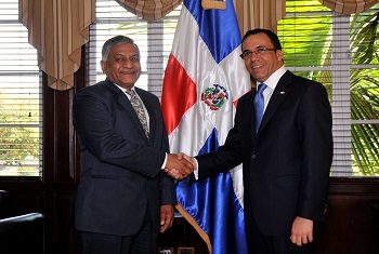 SANTO DOMINGO.- El ministro de Relaciones Exteriores, Andrés Navarro, se reunió este lunes con el ministro de Asuntos Exteriores de La India, general retirado Vijay Kumar Singh, con quien abordó diferentes temas de interés común para ambas naciones, en el orden de desarrollo económico, social, tecnológico y de cooperación.