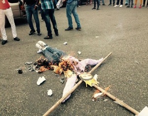Manifestantes crucifican e incendian en la UASD muñeco con foto de Félix Bautista