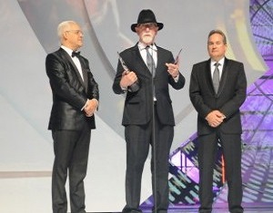 El actor Iván García recibe la estatuilla de la mano de Franklin León, presidente de la CND, y José Antonio Aybar, presidente de ACROARTE.