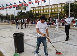 SANTOD DOMINGO.- El cantante urbano Enmanuel Herrera (El Alfa) reanudó este lunes su actividad de barrer la Plaza de la Bandera, para seguir dándole cumplimiento a la sanción impuesta por el Ministerio Público por publicar en un video palabras que insultan a los Padres de la Patria.