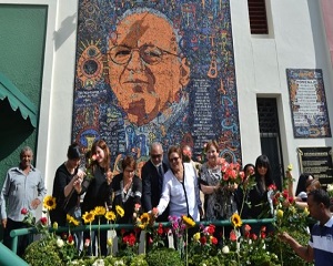 Desde tempranas horas la gente deposita flores frente a un mural con la imagen Cocco en la Editora Alfa & Omega, de la que fue fundador en 1970, en la avenida José Contreras en esta capital.