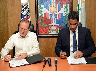El administrador general de la Lotería, doctor José Francisco Peña Gómez, firmó el acuerdo junto al viceministro de Obras Públicas para el fomento de la Pymes, Ignacio Méndez.