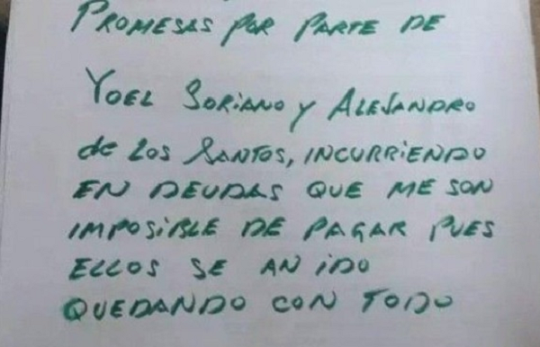 “Me dejé llevar de promesas por parte de Yoel Soriano y Alejandro de los Santos, par de ladrones”, escribió la víctima en una hoja escrita con tinta verde.