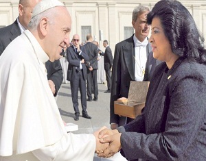 SANTO DOMINGO.- La presidenta del Senado, Cristina Lizardo, fue recibida este miércoles por el papa Francisco en el Vaticano. La funcionaria asistió al encuentro junto a la delegación de congresistas que participa en el Primer Foro Parlamentario Italia-América Latina y el Caribe.