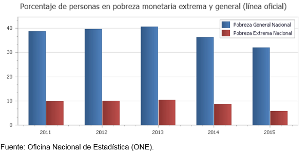 Según cifras oficiales del año 2015 de la Oficina Nacional de Estadística, la pobreza en nuestro país ronda el 33% y la pobreza extrema ronda el 8%, al tiempo que en las cifras no-oficiales la pobreza y la pobreza extrema rondan el 40% y un 15% respectivamente.