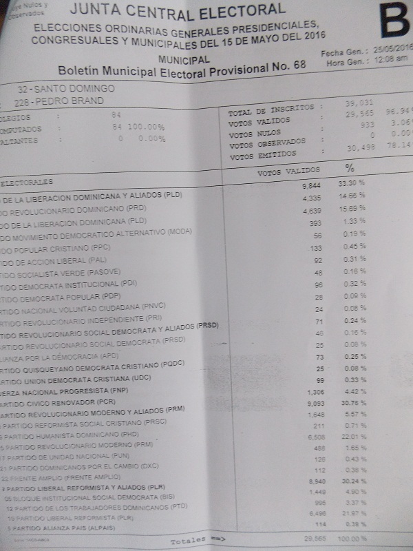 Tras concluir con esa fase, la Junta Electoral remitió a la JCE el míercoles 25 a las 12:08 de la medianoche, el útimo boletin municipal electoral, el No. 68, en el que otorgaba 9,844 (33.30%) votos al candidato de la alianza PLD-PRD, Ramón Pascual Gómez Abreu (El Mello); 9, 093 (30.76%) a kimberly Taveras Duarte, del PRM y aliados y 8,940 830.24) a la exdiputada Mirtha Elena Pérez, del Partido Liberal Reformista (PLR).
