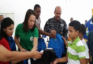 SANTO DOMINGO.- La Presidenta de la Asociación de Esposas de Oficiales de la Policía Nacional Katiusca Viviano de Peguero, con el apoyo de la jefatura policial dirigida por el jefe de la policía, mayor general Nelson Peguero Paredes, inició su acostumbrada jornada de entrega de útiles escolares a nivel nacional a niños, niñas y adolescentes, hijos de policías.
