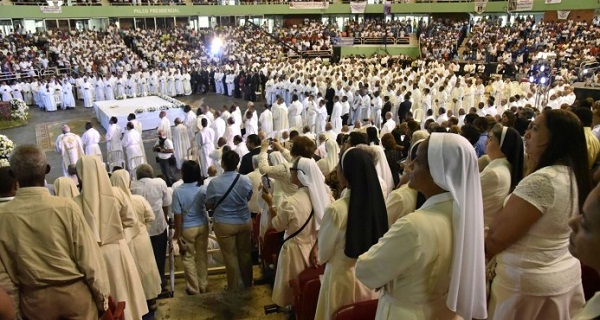 SANTO DOMINGO.-Cientos de feligreses católicos se encuentran este sábado en el Palacio de los Deportes Virgilio Travieso Soto para participar de la eucaristía solemne por la entronización de monseñor Francisco Ozoria como nuevo arzobispo metropolitano de Santo Domingo.