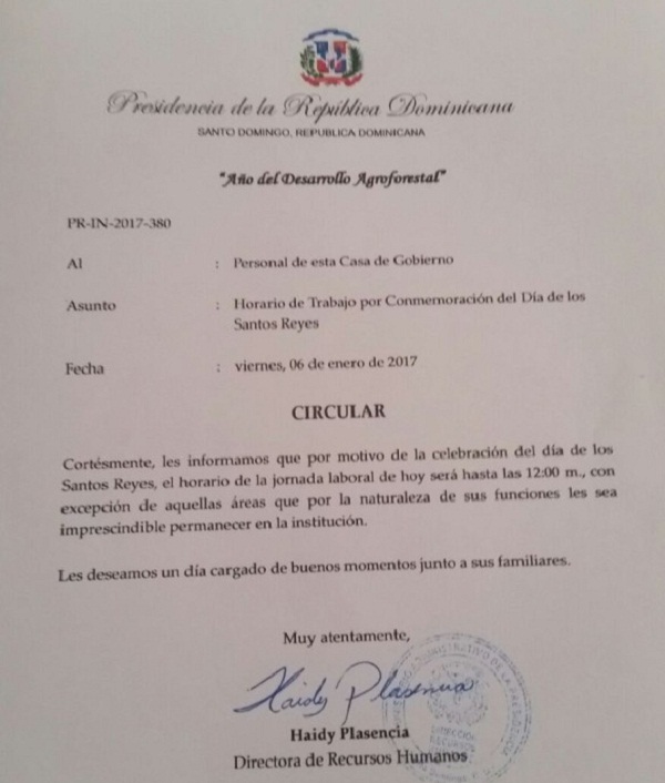 SANTO DOMINGO.- La directora de Recursos Humanos del Palacio Nacional distribuyó este viernes una circular en la que informa al personal del Palacio Nacional que por motivo del Día de los Santos Reyes el horario de la jornada laboral de este viernes 6 de enero será hasta el mediodía con excepción de aquellas áreas que por la naturaleza de sus funciones les sea imprescindible permanecer en la institución.