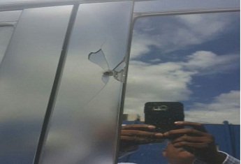 PEDRO BRAND.- El alcalde de este municipio, Ramón Pascual Gómez Abreu (El Mello), denunció este domingo que anoche el vehículo donde viajaba por la avenida John F. Kennedy con Núñez de Cáceres, recibió un impacto de bala del lado del chofer, realizado por un desconocido que transitaba en una motocicleta por la citada vía.