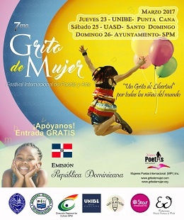 SANTO DOMINGO.- La Fundación Mujeres Poetas Internacional (MPI) Inc. en asociación con la marca Grito de Mujer®, la Universidad Autónoma de Santo Domingo (UASD), el Ayuntamiento de San Pedro Macorís (SPM), la Dirección Provincial de Cultura SPM, anunció el cierre de los eventos del 7mo. Festival Internacional de Poesía y Arte Grito de Mujer 2017 bajo el lema: Un Grito de Libertad.