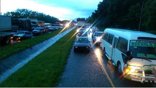 Tránsito congestionado en la autopista Duarte por río desbordado