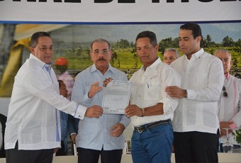 Una comunicación de prensa del Instituto Agrario Dominicano (IAD) dice que los parceleros que recibieron los títulos de las manos del jefe de Estado tenían 40 y 50 años esperando recibir ese documento, que a partir de ahora le abre las puertas al crédito y los convierte en legítimos propietarios de sus terrenos.