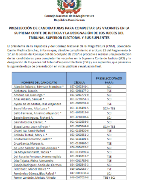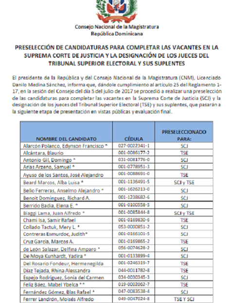SANTO DOMINGO.- El Consejo Nacional de la Magistratura dio a conocer los nombres de los 85 preseleccionados para integrar a la Suprema Corte de Justicia y el Tribunal Superior Electoral, entre ellos el actual presidente del TSE, Mariano Rodríguez, y los también miembros de ese organismo John Guiliani Valenzuela y Marino Mendoza, así como el juez coordinador de los juzgados de Instrucción del Distrito Nacional, José Alejandro Vargas.