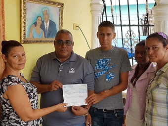 El alcalde Ramón Pascual Gómez Abreu (El Mello) entregó el cheque a la señora Sonia Altagracia Fernández Ventura, cuyo hijo, Waldy Radhamés Rodrigúez Fernández, de 25 años de edad, recibirá de su hermano Starling Antonio uno de sus riñones.
