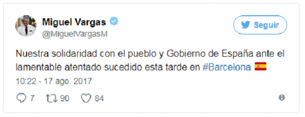 Vargas Maldonado declaró en su cuenta de Twitter: “Nuestra solidaridad con el pueblo y Gobierno de España ante el lamentable atentado sucedido esta tarde en #Barcelona”.