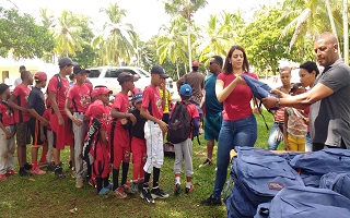 PEDRO BRAND.- El pelotero de Grandes Ligas Jarlin García (Malibú), nativo de este municipio y lanzador de los Marlins de Miami, junto a la Fundación Génesis Mercedes regaló cientos de mochilas y otros útiles escolares a niños de varios sectores en este municipio.