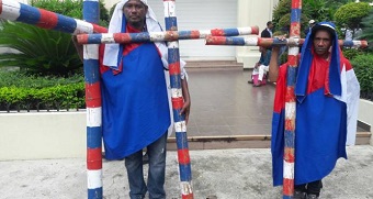 SANTO DOMINGO.- Tres peregrinos del municipio Villa Altagracia se apostaron frente a la Casa Nacional del Partido de la Liberación Dominicana (PLD) donde se desarrolla la reunión de su Comité Político, este sábado.