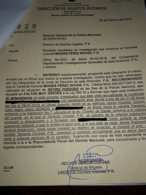 SANTO DOMINGO.- La Dirección de Asuntos Internos de la Policía Nacional recomendó el ”retiro forzoso” del teniente coronel Moisés Pérez Novas porque supuestamente habría violado sexualmente a un civil cuyo nombre se omite por razones éticas.