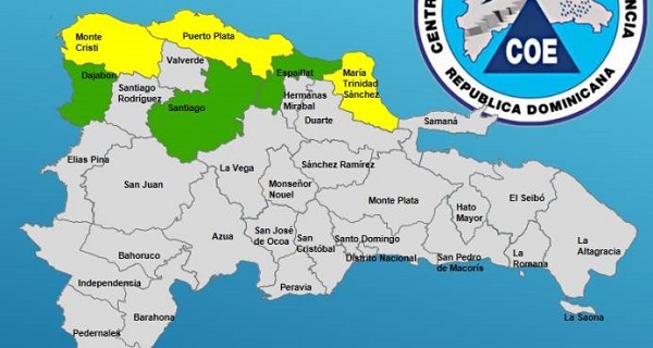 SANTO DOMINGO.- El Centro de Operaciones de Emergencias (COE) informó este viernes que amplía y mantiene en alerta amarilla a Puerto Plata, Montecristi y María Trinidad Sánchez, y en alerta verde a Dajabón, Espaillat y Santiago.
