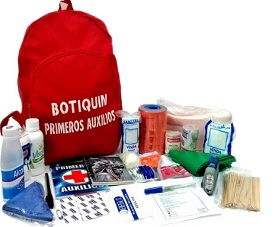 Manual de primeros auxilios, Gasa estéril, Cinta adhesiva, Vendas adhesivas, Toallitas antisépticas, Jabón, Crema de hidrocortisona al 1%, Acetaminofén [Tylenol, por ejemplo] e ibuprofeno [puede ser Advil], Antialérgicos, Antiácido, Tijeras, Alcohol, Repelente, Loción de calamina, Linterna con pilas de repuesto, Guantes de plástico, Termómetro y alguna Pomada para quemaduras.