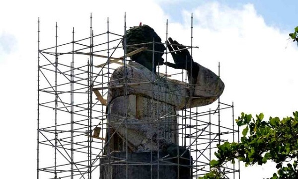En cualquier ángulo de toda la edificación sobresalen los andamios colocados para facilitar el proceso de remozamiento. Esta estructura provisional también rodea la imponente estatua del sacerdote español.