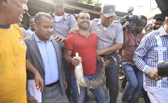 SANTO DOMINGO.- En medio de un gran alboroto, autoridades del Ministerio de Medio Ambiente y agentes de la Policía Nacional recuperaron al cocodrilo que desde tempranas horas comunitarios mantenían secuestrado luego de capturarlo en una cañada de Barrio Nuevo, en Sabana Perdida, Santo Domingo Norte.