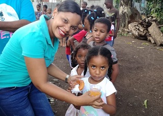 PEDRO BRAND.- La comunitaria y política, licenciada Bianca Noemí Valdez, llevó alegría la tarde de este domingo a cientos de niños del sector Los Cocos en el kilómetro 28 de la autopista Duarte en este municipio, con quienes compartió refrescos y donas