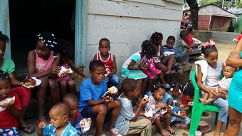 El grupo de damas de la organización que preside la licenciada Digna García, compartió ayer con los pequeños de esas apartadas comunidades Sandwich, Biscochos y Jugos.