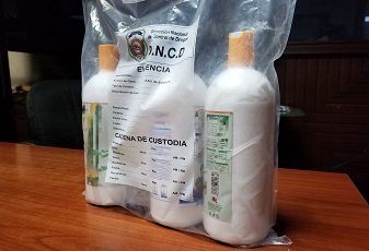 Los envases plásticos que simulaban ser productos para el cuidado del cabello tenían 3.53 kilogramos de cocaína líquida, según determinó el análisis del Instituto Nacional de Ciencias Forenses (INACIF).