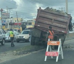 Camión cargado de arena y piedra se accidenta en la autopista Duarte y provoca tapón