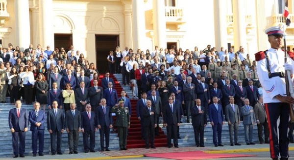 SANTO DOMINGO.- El presidente Danilo Medina, acompañado de su gabinete, encabezó el tradicional acto de izamiento de la Bandera Nacional en la explanada frontal del Palacio Nacional.