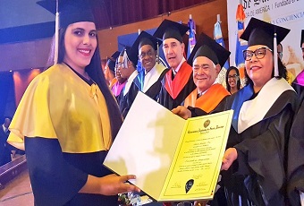 Felicitó a los graduandos en las diferentes carreras, especialmente a los que obtuvieron lauros académicos, así como a sus familiares, exhortándoles a coadyubvar para que en esta nación se alcancen más altos niveles de desarrollo humano con equidad.