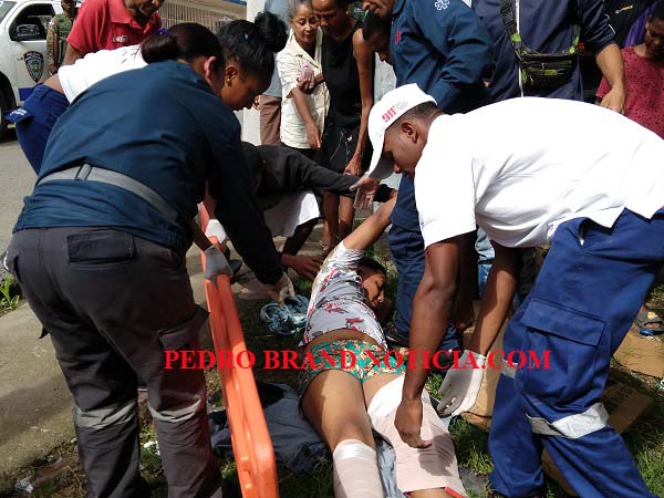 El delívery, que conducía una motocicleta marca Honda CC-50 color rojo, permaneció varios minutos tirado en la acera, llorando por el fuerte dolor en ambas piernas y tras ser asistido por los paramédicos, fue llevado al Hospital doctor Rodolfo de la Cruz Lora de aquí y luego referido al Hospital Salvador B. Gautier en la capital, donde se dijo sería intervenido por cirugía.