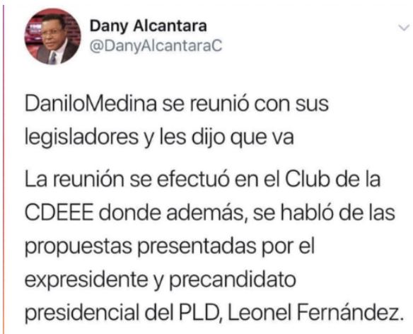 El tuit expresaba que en la reunión que sostuvo el presidente Medina el pasado lunes con algunos congresistas de su tendencia en el club de la Corporación Dominicana de Empresas Eléctricas Estatales (CDEEE), “les dijo que va”.