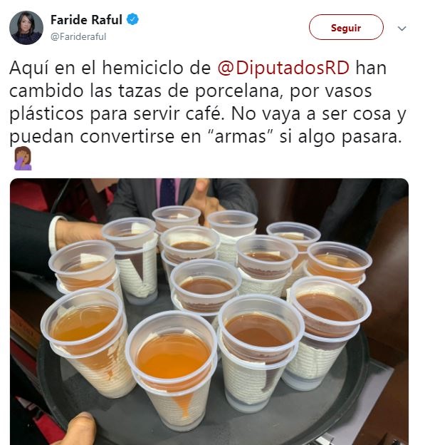 A quien no le pasó desapercibida la medida fue a la diputada del opositor Partido Revolucionario Moderno (PRM) Faride Raful, que publicó en su cuenta de Twitter: “Aquí en el hemiciclo de @DiputadosRD han cambiado las tazas de porcelana por vasos plásticos para servir café. No vaya a ser cosa y puedan convertirse en armas si algo pasara”.