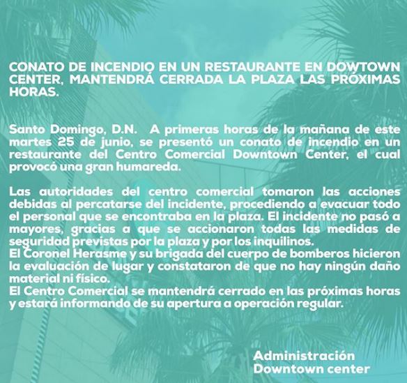 SANTO DOMINGO.- El centro comercial Downtown Center emitió un comunicado donde explican que debido al incendio que afectó sus instalaciones en la mañana de hoy, se mantendrá cerrado por varias horas.