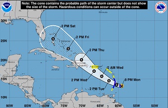 En su boletín de anoche, el NHC indicó que la tormenta mantenía sus 60 millas por hora (95 km/h) de vientos máximos sostenidos y se encontraba a unas 60 millas (95 km) al sureste de Barbados y unas 165 millas (270 km) al este sureste de Santa Lucía.