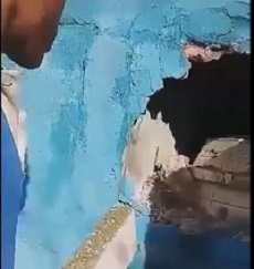 Segundo después, el estudiante que graba el video dice “dale a la caja”, acción siguiente, el que manejaba la cruz como si se tratase de un mazo, impacta el ataúd que contiene los restos de la persona sepultada, provocándole un hoyo, por el cual otro estudiante introduce un palo.