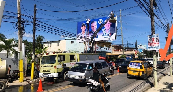 En las fotografías que acompañan la instancia presentada, se observa un camión-grúa del Cuerpo de Bomberos de Nagua, con personal del ayuntamiento, instalando vallas publicitarias en la avenida María Trinidad Sánchez, próximo al parque municipal del mismo nombre, con las imágenes del candidato presidencial del PRM, del candidato a senador de dicho partido y la propia imagen del alcalde, quien es también candidato.