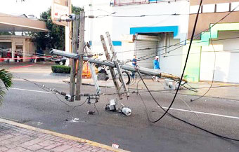 SANTO DOMINGO.- Un poste del tendido eléctrico fue derribado en medio de la calle San Martín esquina Marcos Adón, en el sector Villa Consuelo.