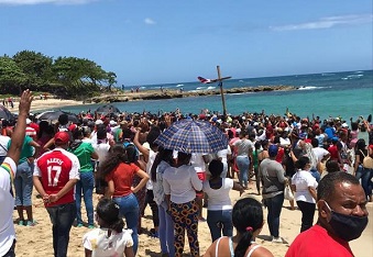 PUERTO PLATA.- Desafiando las normas del distanciamiento social, que buscan disminuir los contagios por EL COVID-19, cientos de personas acompañaron al Peregrino de Villa Altagracia a llevar una cruz en la playa del malecón de esta ciudad, bajo un candente sol proclamando que a partir del lunes la enfermedad comenzará a desaparecer del país.