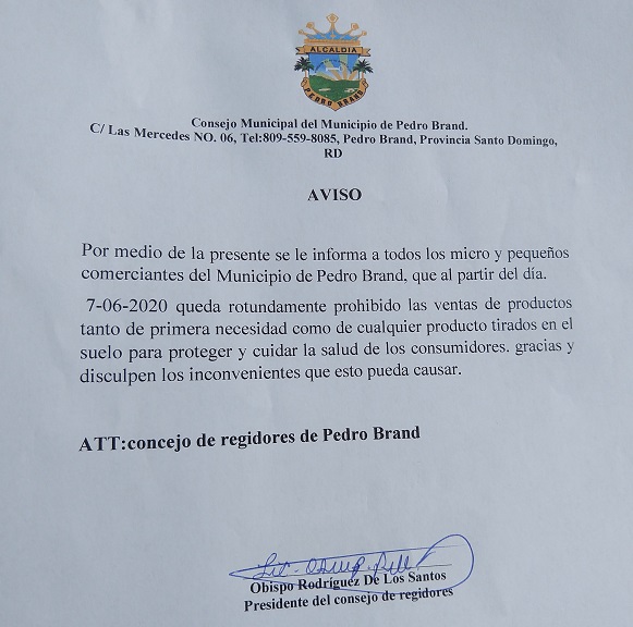 PEDRO BRAND.- El Concejo de Regidores de Pedro Brand comenzó a notificar este sábado a las personas que tienen puestos de ventas en el Mercado Municipal, una resolución que prohíbe «rotundamente» colocar los productos para el consumo humano y mercancías en el suelo.