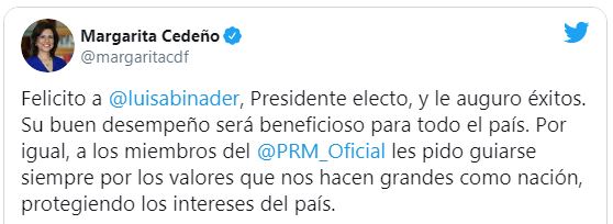 «Agradezco a la vicepresidenta Margarita Cedeño por sus buenos deseos», fue la respuesta de Luis Abinader al siguiente mensaje: